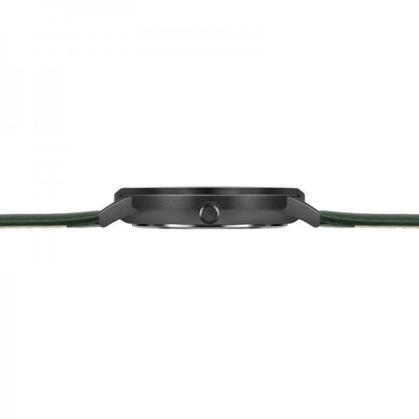On an elegant 16mm bottle green leather strap, with edge stitching, the gunmetal case with white dial give the watch a unique style.