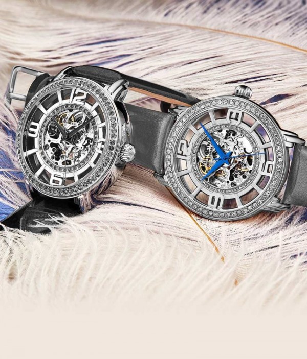 The Winchester’s skeletonized outer dial, studded with dazzling crystals, frames the exposed movement in a striking display.